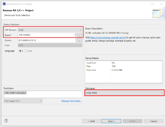 - Select the FSP version (e.g., 5.5.0) and set the board to AIK-RA6M3.