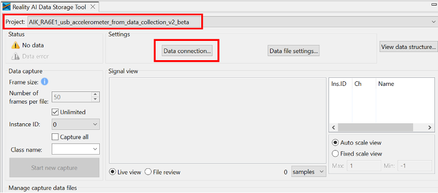 - Go to the Reality AI Data Storage Tool view.