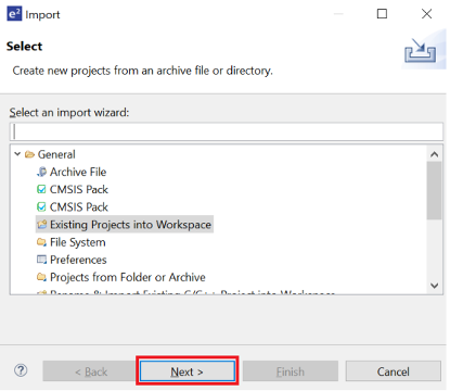 - Navigate to General > Existing Projects into Workspace and click Next.