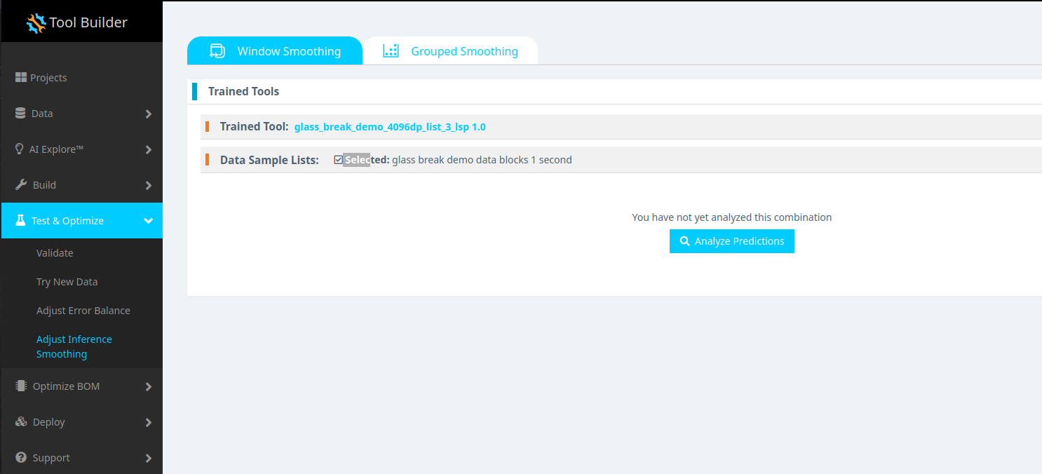 This section explains how to test and optimize your trained model using the Inference Smoothing feature in Reality AI Tools. Inference smoothing improves model stability by averaging prediction outcomes over a specified range, reducing noise in real-time predictions.