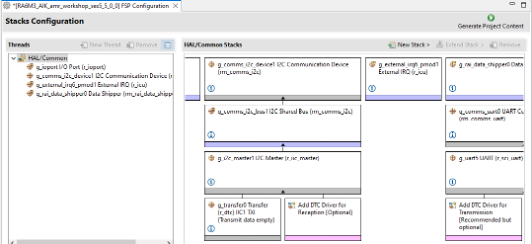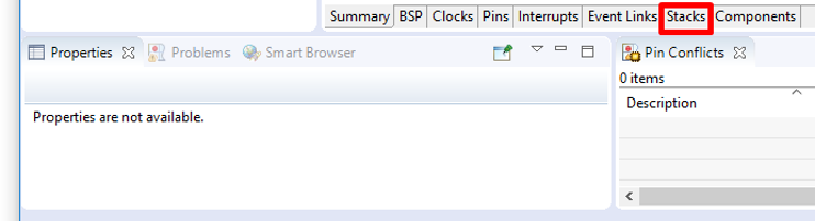 - Once the new project is created, e² Studio automatically switches to a layout optimized for developing Renesas RA projects. Select the Stacks tab at the bottom of the FSP Configuration view.