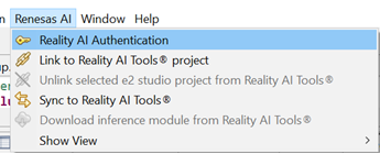 E2 Studio を開き、「Renesas AI → Reality AI Authentication」に進みます。