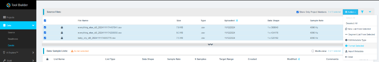 データの形式が 1 x {サンプル数} に、サンプリングレートが 4096 Hz に設定されていることを確認します。