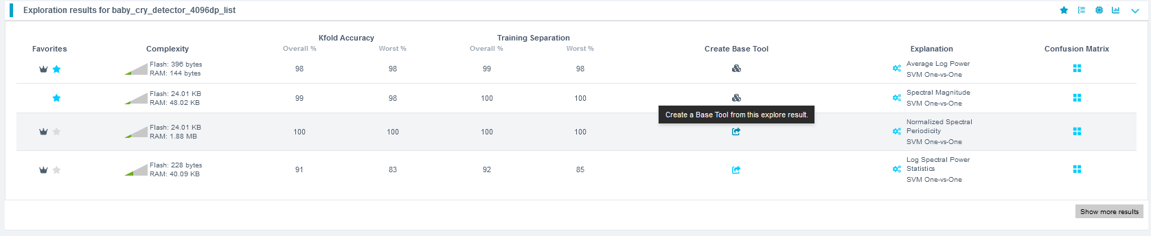 「Start Explore」ボタンをクリックすると、Reality AI のアルゴリズムがデータ上で複数の特徴量セットと機械学習モデルを試行し、分類精度とリソース使用量に基づいてベストな結果を抽出します。