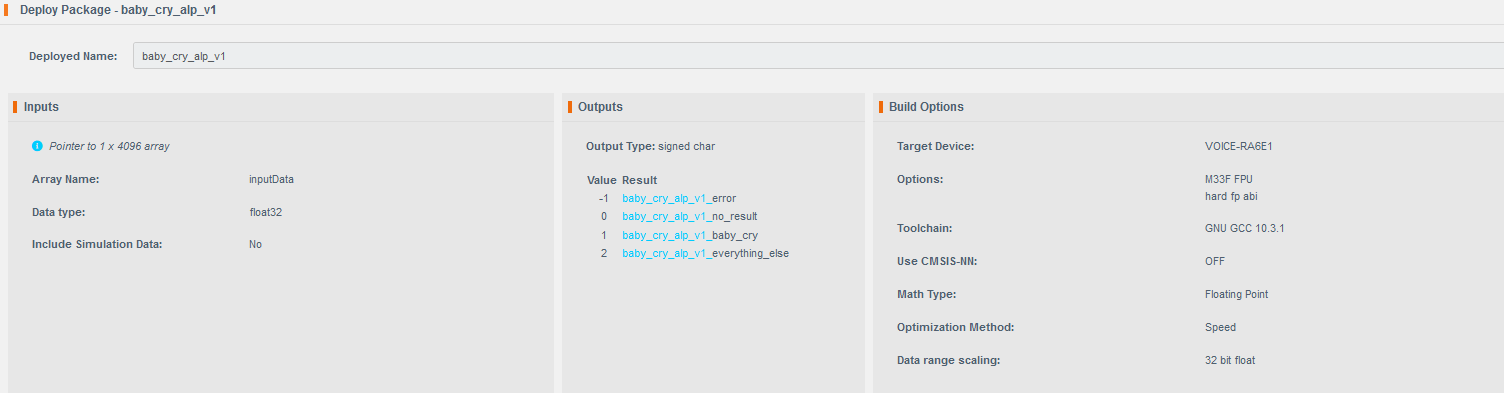 オプションを設定します。モデル名は baby_cry_lsp_v2 とすると、E2-Studio のコードと整合性が取れます(他の名前にするとコードの修正が必要になります)。