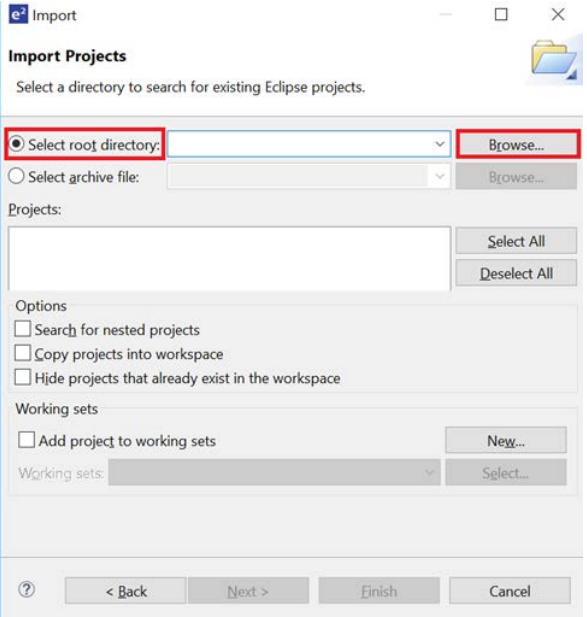 「Select root directory」を選び、「Browse」でサンプルプロジェクトのフォルダを指定します。