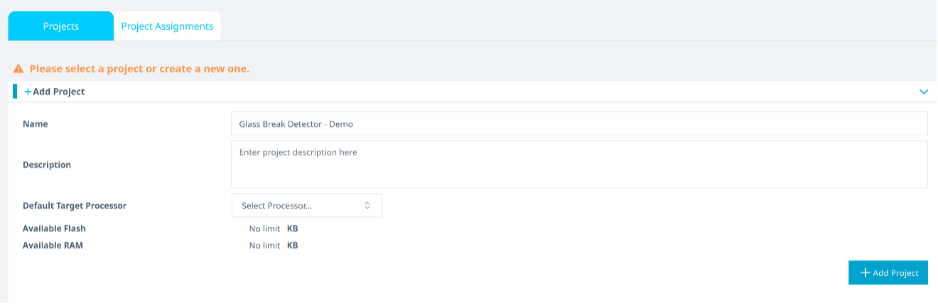 - Click + Add Project, provide a name and optional description, then click the bottom +Add Project button.