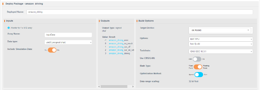 This section describes how to deploy and test the trained model on the Renesas AIK-RA6M3 hardware. You will configure the project, integrate the model into the source files, compile the application, and observe the LED indicators for model inference output.