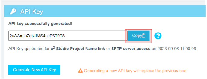 表示された API キーをコピーします。これは E2 Studio IDE と Reality AI Tools を接続する際に使用します。