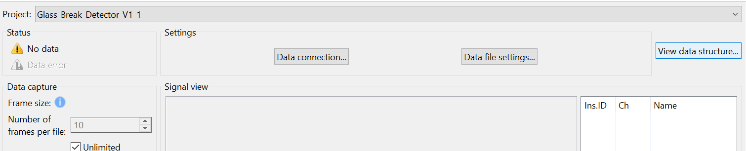 本プロジェクトでは「Number of frames per file = 200」とすると約52秒のデータになりますが、以降の手順では「Unlimited」での収集を前提としています。