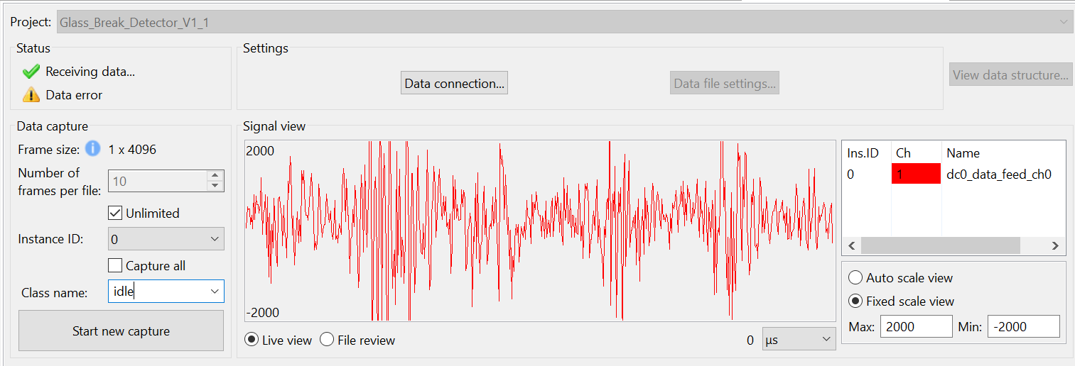 「Reality AI Data Storage Tool」ビューを開き、Signal view に波形が表示されているか確認します。表示されない場合は、「File review」→「Live view」に切り替えます。