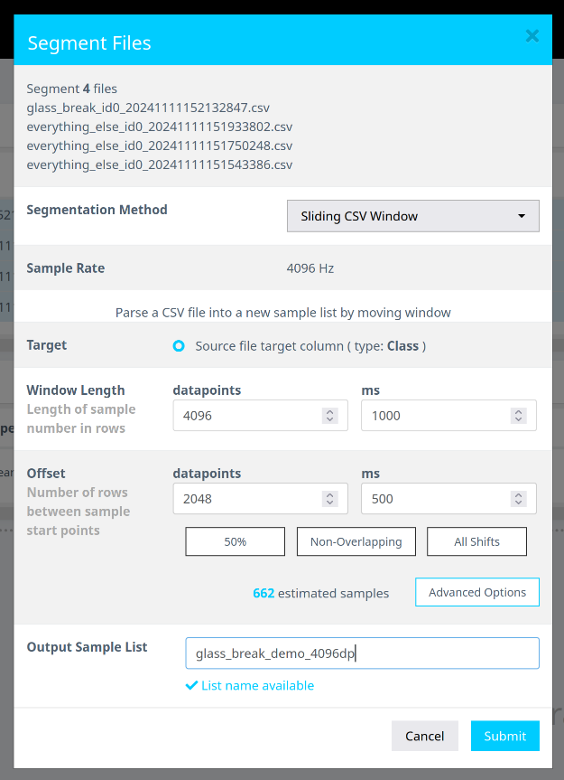 一般的には「50% オーバーラップ」が推奨されます。大量のデータがある場合は、オフセットを大きくして重複を減らしても構いません。