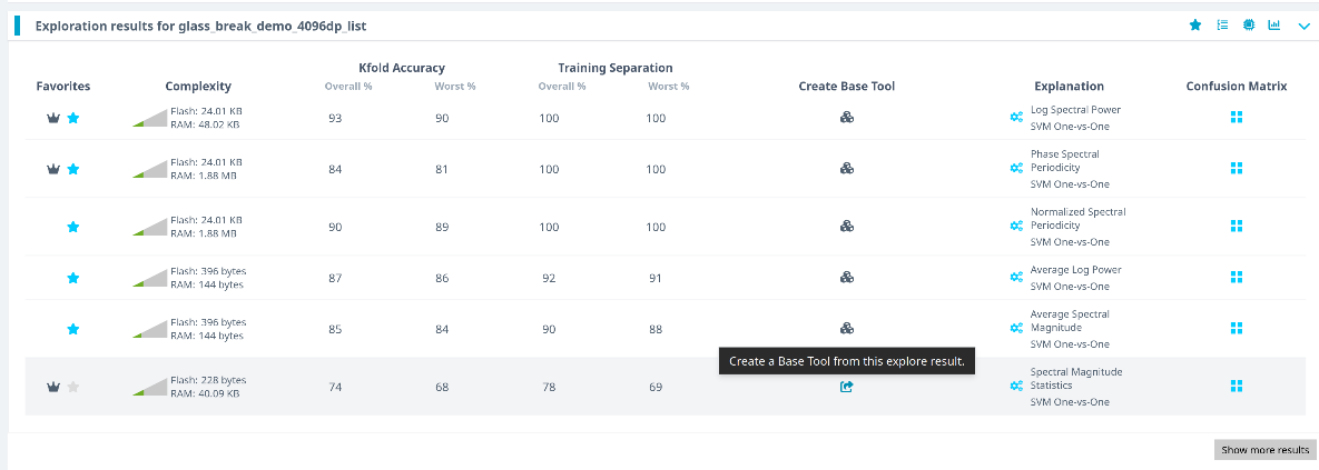 Explore が終了したら、最も性能が高いモデル(推奨:feature space = Spectral Magnitude)を選択し、「Create Base Tool」ボタンをクリックします。