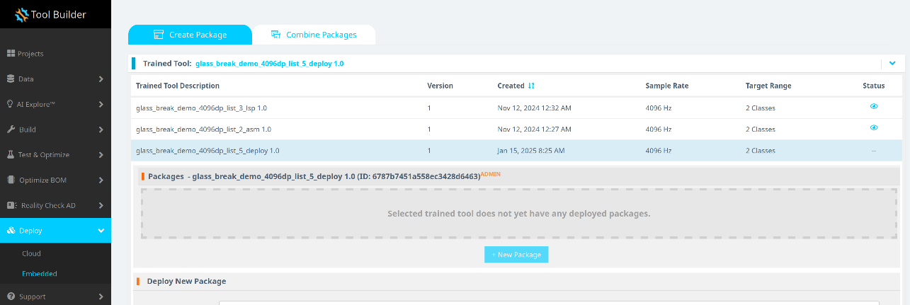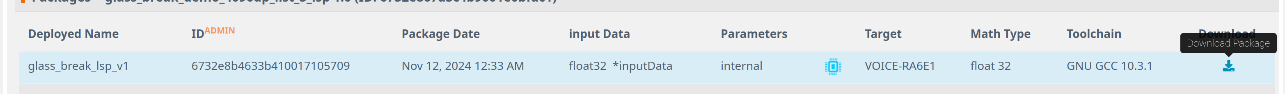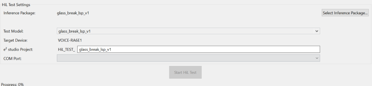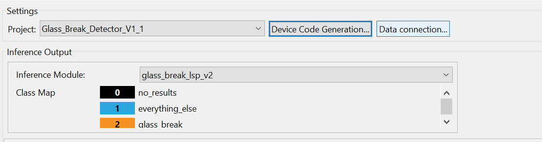 推論パッケージ/モデルを選択します。Reality AI Tools アカウントからトレーニング済みモデルを選択してください。Explorer Tier ユーザーは、事前に読み込まれた glass_break_lsp_v1 を選べます。